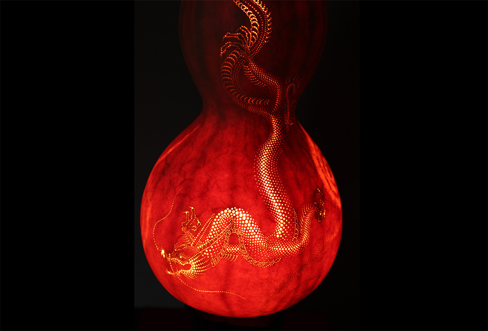 それぞれの瓢箪の個性を生かし、計算された美しい光を導き出す、ひょうたんランプ作家の宇佐美啓治。